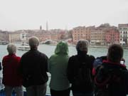 | Na een goede nachtrust in een hut aan boord wachten we met ongeduld op het naderende Venetië. De enige toeristen die je er ziet, lopen allemaal met een parapluie op.